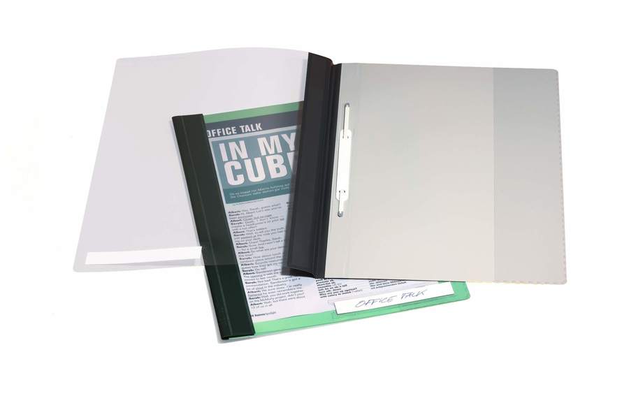Przeźroczysta przednia okładka z grubej i sztywne folii PCV, grzbiet z wytrzymałej i elastycznej folii PCV odpornej na pęknięcia